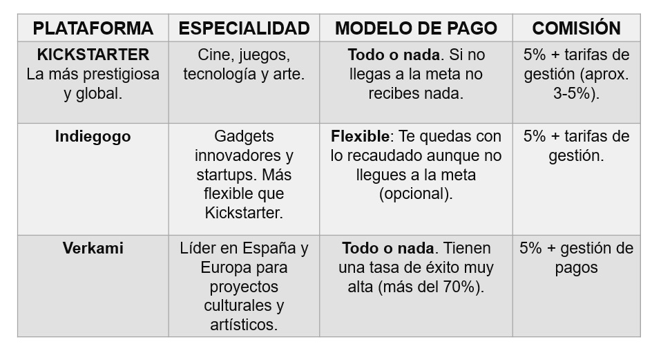 Existen plataformas de crowdfunding por especialidad, y cada una tiene modelos de pago y comisiones diferentes. Estos son 3 ejemplos de plataformas digitales de crowdfunding pero hay muchas más.